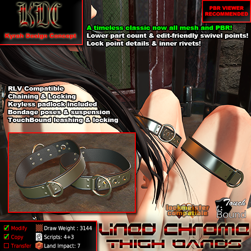 Another Lined Chrome series update! The Lined Chrome Ankle cuffs now have the same changes as the collar (PBR & PBR lock support), but it also has the chain rattle effect of the Morgiana Ankle Shackles.